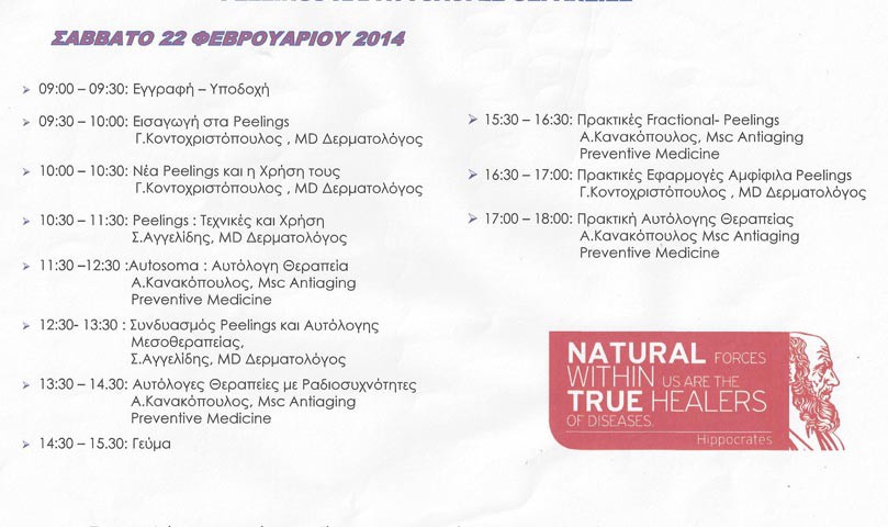 November 25, 2015Ο δερματολόγος Στέλιος Αγγελίδης, παρουσιάζει στην Ημερίδα Αναγεννητικής Ιατρικής, Τεχνικές και Χρήσεις peelings καθώς και συνδυασμό, peelings και Αυτόλογης Μεσοθεραπείας. Η Ημερίδα διεξήχθει το Σάββατο 22 Φεβρουαρίου 2014, με θέμα “Peelings και Αυτόλογες θεραπείες”.